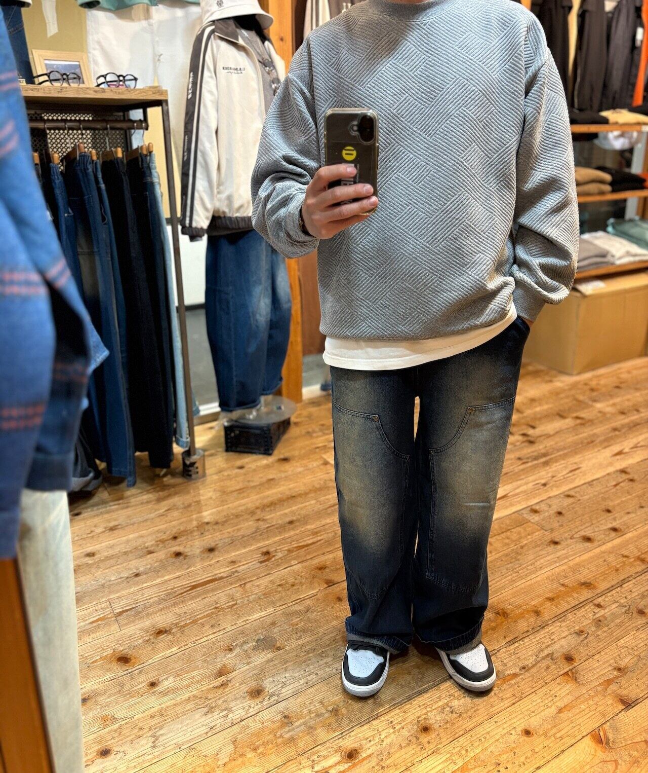 デニムのウォッシュドされた風合い、ダブルニーのパネル切替しが特徴的です。