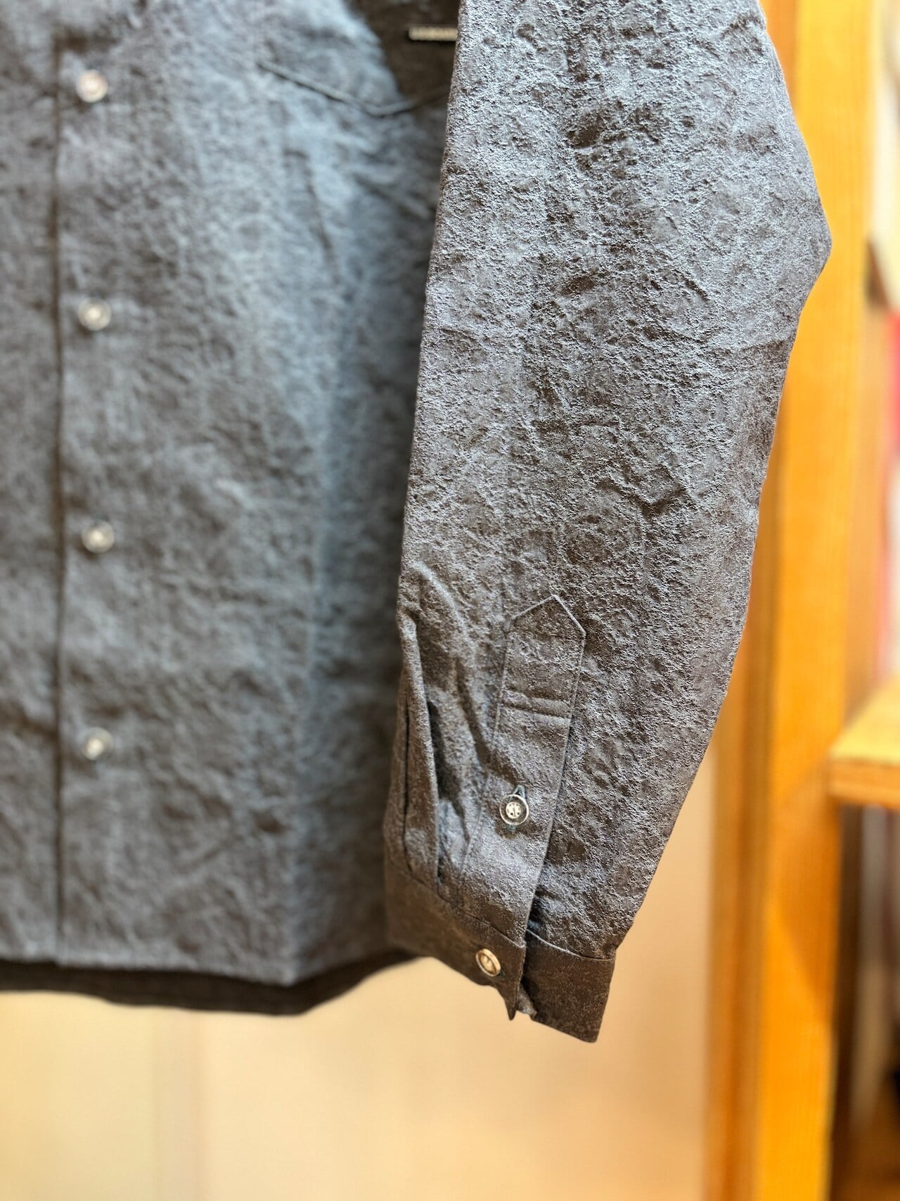 エンボス加工の立体的な素材の凹凸が着こなしのアクセント。陰影が特徴的です。