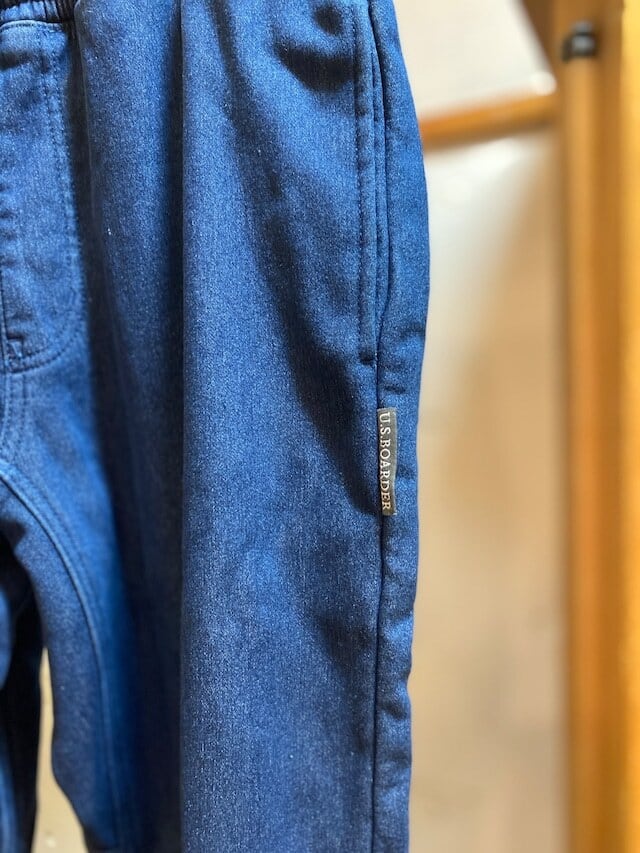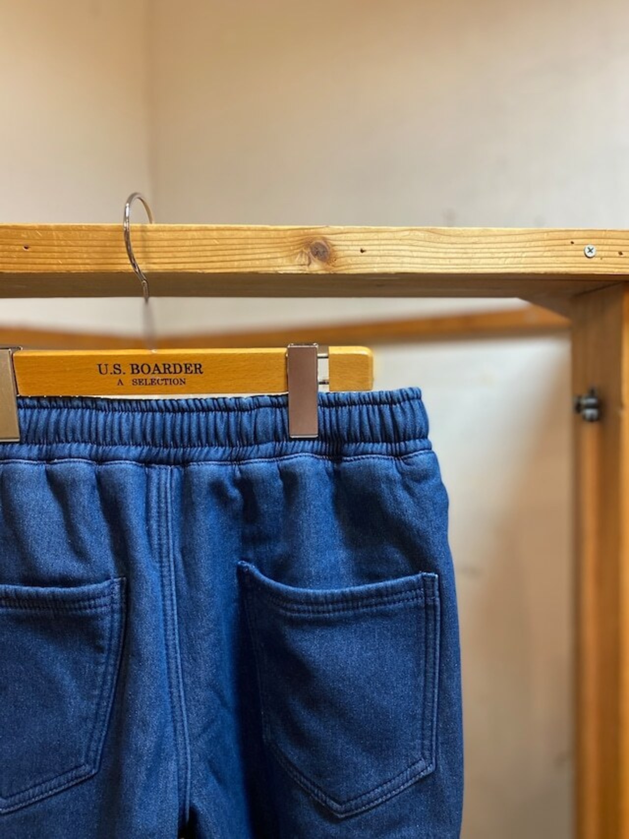インディゴ素材のルックスにデニムの質感が特徴的です。股下の切り替えしがアクセント。