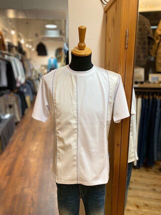異素材パッチワークを縦に魅せたスポーツミックスのカジュアルTシャツです。